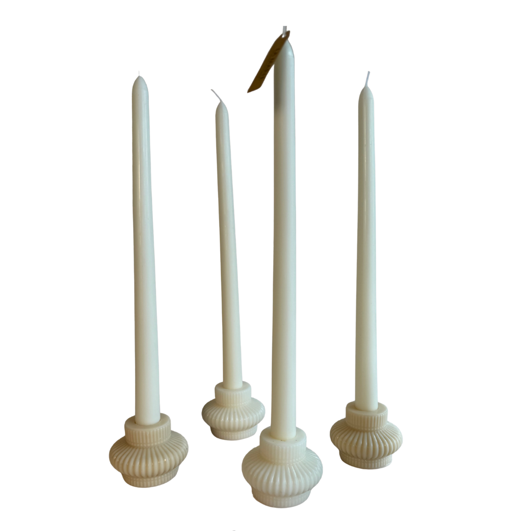 Forma: Base de candelabro en cera con detalles en relieve que evocan la estética clásica y refinada, con velas largas y estilizadas.